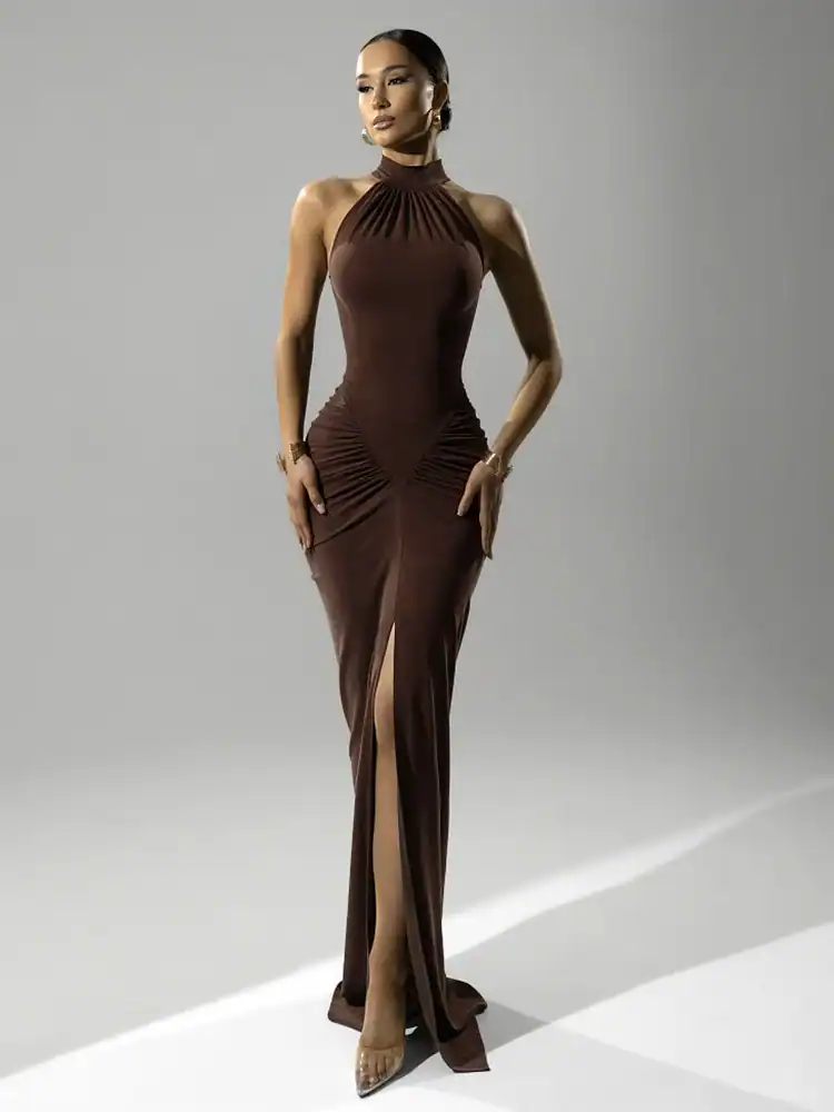 Shop the Mozision Ruched Halter Maxi Dress at Thrive. This sleeveless, floor-length gown features a sexy high split and slim fit. Perfect for clubs and parties!